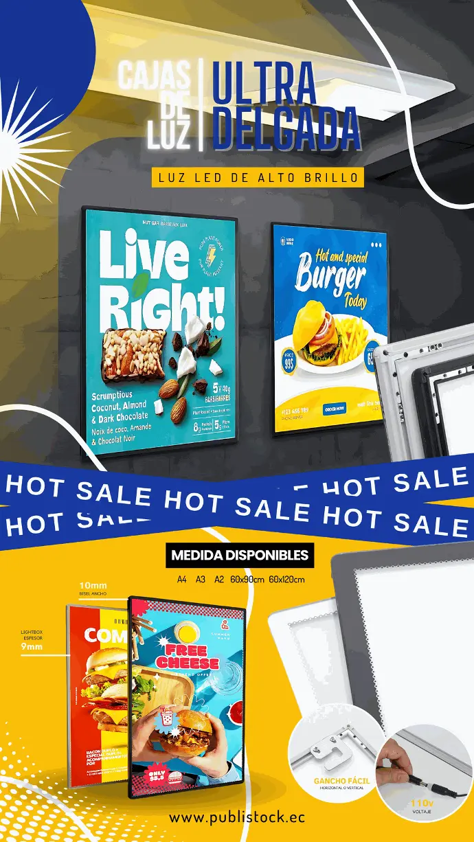 Nuestras Cajas de Luz Ultradelgadas + nuestro accesorio colgante son la solución perfecta para restaurantes que buscan destacar su menú y promociones de manera elegante y moderna. Con solo 1 cm de espesor, estas cajas de luz ofrecen una apariencia sofisticada sin ocupar espacio innecesario. Son fáciles de instalar y permiten cambiar las gráficas sin complicaciones, ideal para mantener tu contenido actualizado y atractivo.